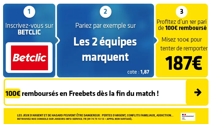 ► Le pari « les 2 équipes marquent » est coté à 1,87 chez Betclic qui vous permet d’obtenir votre 1er pari remboursé de 100€.