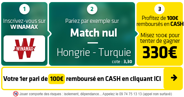 De son côté, la Turquie avait validé son ticket pour l’Euro en terminant seconde de son groupe, dominé par la France. Les Turcs réalisent une campagne de Ligue des Nations solide malgré leur défaite en ouverture face à la Hongrie (1-0). La sélection de Senol Gunes a enchainé ensuite trois matchs nuls avant de finalement s’imposer face à la Russie (3-2) le week-end dernier. Mal embarquée, la sélection turque a profité de l’expulsion de Semenov pour renverser l’équipe russe. Avec 6 points, la Turquie est toujours dans le coup pour la montée en Ligue A mais dépend également des résultats de ses rivaux. Les sélections hongroises et turques semblent assez proches et elles perdent peu. Elles pourraient se neutraliser avec un match, une grosse cote à tenter avec les 100€ remboursés à cash offerts par Winamax.