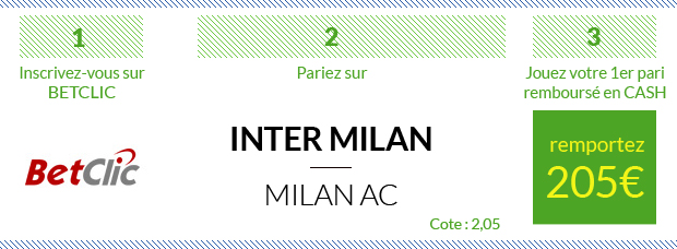 Pour miser sur ce derby milanais, on vous propose de parier avec 3 sites vous offrant 100€ de bonus EN CASH sur votre 1er pari. Si vous perdez, vous êtes remboursé en ARGENT REEL et vous pouvez retirer directement vos 100€ sur votre compte bancaire !!!
