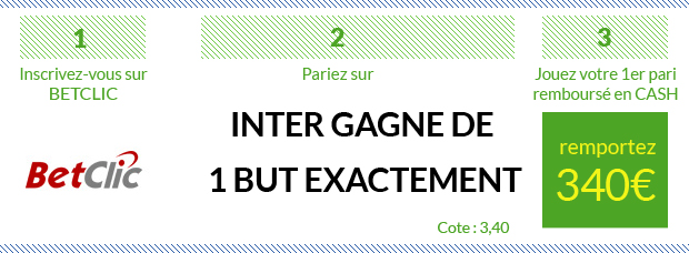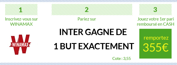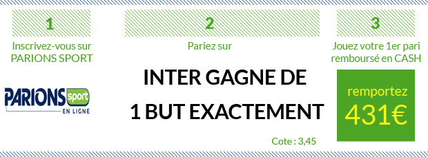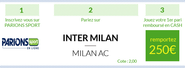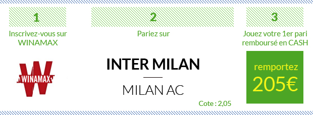 ► Si vous avez envie de tester d’autres sites de paris sportifs, 8 autres sites vous permettent de parier sur ce Inter – Milan AC:– Un nouveau bonus paris sportifs de 100€ avec Betstars – Un bonus EXCLUSIF de 210€ avec NetBet qui vous offre en ce moment un premier pari remboursé de 190 + 20€ de bonus en exclu en rentrant le code « SOFOOT » lors de votre inscription – Un bonus EXCLUSIF de 120€ avec Unibet qui vous offre en ce moment 120€ de paris gratuits, peu importe que votre premier pari soit gagnant ou perdant, en rentrant le code « SOFOOT » lors de votre inscription – Un premier pari remboursé de 107€ avec bwin – Un bonus ÉNORME de 150€, dont 60€ pour seulement 20€ déposés, avec ZEbet – Un bonus ÉNORME de 200€, dont un premier pari remboursé de 100€ avec France Pari – Un premier pari remboursé de 50€ avec Genybet – Un bonus paris sportifs de 100€ avec PMU Sport