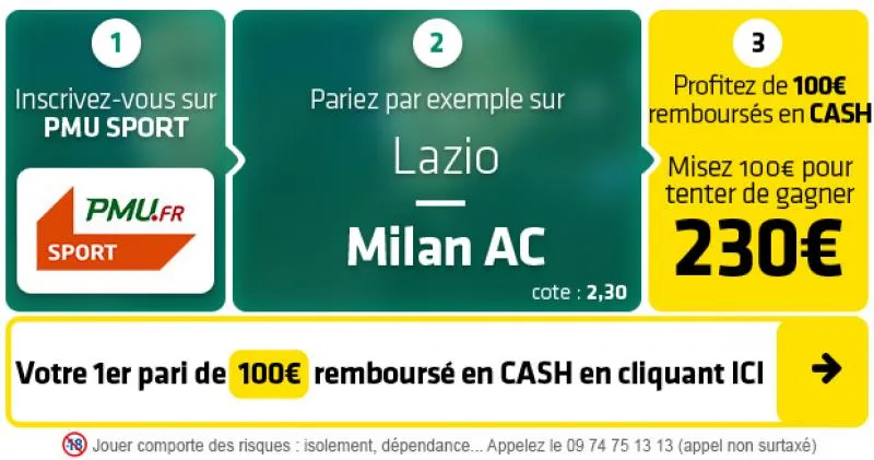 ► Le pari « Victoire Milan AC » est coté à 2,30 chez PMU Sport qui vous rembourse votre 1er pari de 100€ remboursé EN CASH
