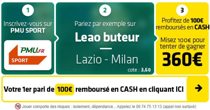 ► Le pari « Leao buteur » est coté à 3,60 chez PMU Sport qui vous rembourse votre 1er pari de 100€ remboursé EN CASH