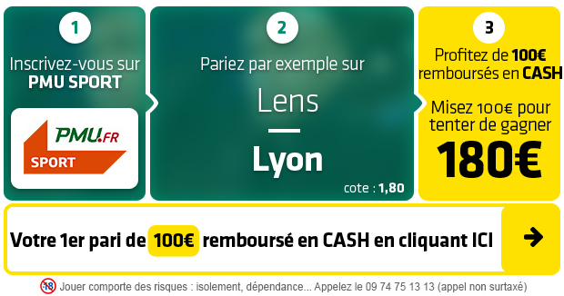 ► Le pari « Victoire Lyon » est coté à 1,80 chez PMU Sport qui vous offre pendant quelques semaines seulement votre 1er pari de 100€ remboursé EN CASH