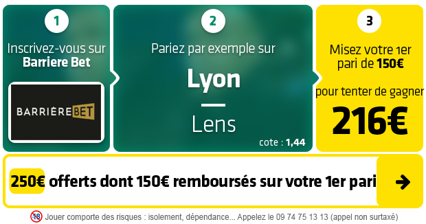 – Misez par exemple votre 1er pari remboursé de 150€ sur ce pari pour tenter de remporter 216€.- Si votre pari est perdant, vos 150€ vous sont remboursés en paris gratuits.