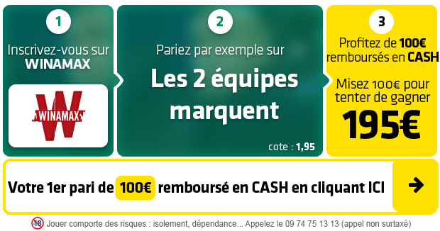 ► Le pari « Les 2 équipes marquent » est coté à 1,95 chez Winamax qui offre un 1er pari remboursé de 100€ EN CASH