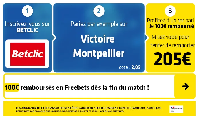 ► Le pari « Victoire Montpellier » est coté à 2,05 chez Betclic qui vous permet d’obtenir votre 1er pari remboursé de 100€.