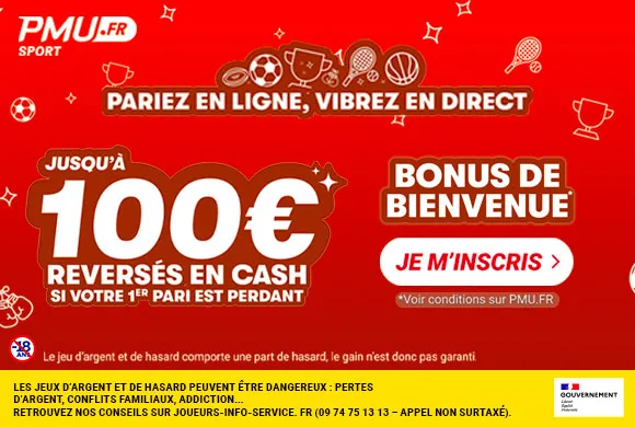 Cliquez ici ou sur l’image ci-dessous pour vous inscrire chez PMU et profiter de 100€ en CASH.