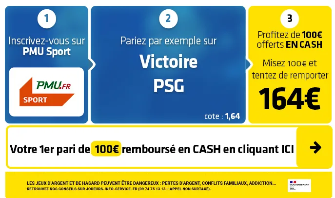 ► Le pari « Victoire PSG » est coté à 1,64 chez PMU Sport qui vous rembourse votre 1er pari de 100€ remboursé EN CASH.