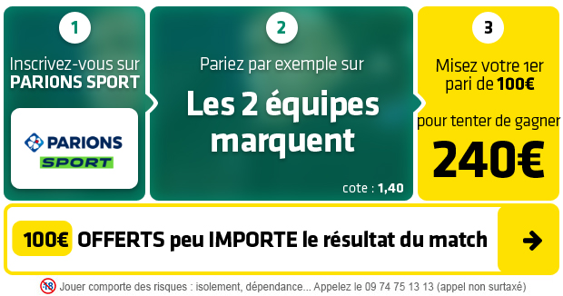 ► Profitez de 100€ chez ParionsSport peu importe le résultat de votre 1er pari : – Inscrivez-vous en cliquant ici – Vous avez le droit à un 1er pari remboursé en pari gratuit de 100€ SANS CONDITIONS – Misez par exemple votre 1er pari de 100€ sur ce pari pour tenter de gagner 240€ (140€ du pari + 100€ de bonus)- Que votre pari soit gagnant ou perdant, vous recevez forcément 100€ de paris gratuits ! – Vous pouvez utiliser vos 100€ pour continuer à parier