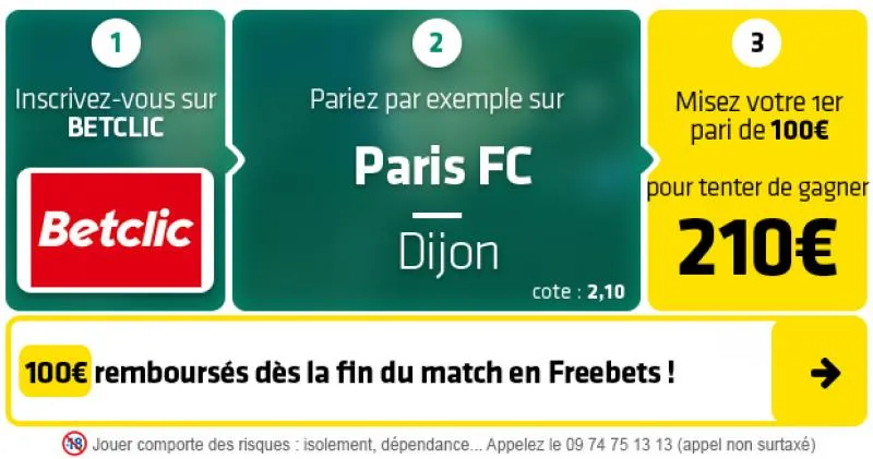 ► Le pari « Victoire Paris FC » est coté à 2,10 chez Betclic qui vous permet d’obtenir votre 1er pari remboursé de 100€