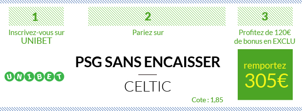 ► Si vous avez envie de tester d’autres sites de paris sportifs, vous pouvez profiter d’autres Bonus sur ce PSG – Celtic : – Un bonus EXCLU de 210€, dont un 1er pari remboursé de 190€ avec NetBet – Un bonus ÉNORME de 150€, dont 60€ à récupérer très facilement avec ZEbet – Un NOUVEAU bonus de 100€, dont un 1er pari remboursé de 50€ avec BetStars – Un remboursement EN CASH de 100€ avec ParionsSport En Ligne – Un bonus ÉNORME de 200€, dont un premier pari remboursé de 100€ avec France Pari – Un premier pari remboursé de 50€ avec Genybet – Un bonus paris sportifs de 100€, avec PMU Sport