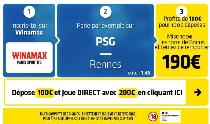 ► Le pari « Victoire PSG » est coté à 1,45 chez Winamax qui vous permet de récupérer 100€ DIRECT (déposez 100€ et jouez avec 200€).