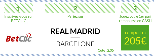► Si vous avez envie de tester d’autres sites de paris sportifs, 8 autres sites vous permettent de parier sur ce Real Madrid – Barcelone :– Un premier pari remboursé EN CASH de 100€ avec ParionsSport En Ligne – Un premier pari remboursé EN CASH de 100€ avec bwin – Un bonus et EXCLUSIF de 110€ avec NetBet qui vous offre en ce moment un premier pari remboursé de 90 + 20€ de bonus en exclu en rentrant le code « SOFOOT » lors de votre inscription – Un bonus EXCLUSIF de 120€ avec Unibet qui vous offre en ce moment 120€ de paris gratuits, peu importe que votre premier pari soit gagnant ou perdant, en rentrant le code « SOFOOT » lors de votre inscription – Un bonus ÉNORME de 150€, dont 60€ pour seulement 20€ déposés, avec ZEbet – Un bonus ÉNORME de 200€, dont un premier pari remboursé de 100€ avec France Pari – Un premier pari remboursé de 50€, pour un bonus total de 250€, avec Joa Sport – Un bonus paris sportifs de 100€ avec PMU Sport – Un premier pari remboursé de 50€ avec Genybet