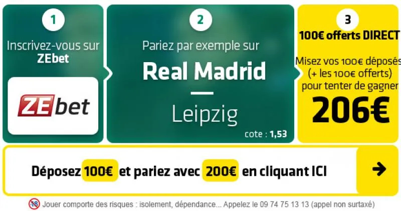 ► Déposez 100€ et misez avec 200€ avec le code SOFOOTX2 chez ZEbet⇒ ⇒ Cliquez ICI pour en profiter ⇐ ⇐