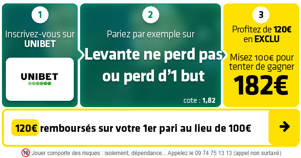 ► Le pari « Levante ne perd pas ou perd de 1 but » est coté à 1,82 chez Unibet, l’un des deux seuls sites de paris sportifs à offrir un bonus EXCLUSIF aux lecteurs de SoFoot ► Profitez d’un bonus EXCLUSIF de 120€ chez Unibet :- Inscrivez-vous avec le code « SOFOOT » – Vous bénéficiez d’un bonus de 120€ au lieu des 100€ habituels- Misez par exemple votre 1er pari de 100€ sur ce pari pour tenter de gagner 182€– Si votre pari est perdant, vous recevez non pas 100€ mais bien 120€ de remboursement en EXCLU avec SoFoot – Et oui, vous pariez 100€ et vous êtes remboursé de 120€ !