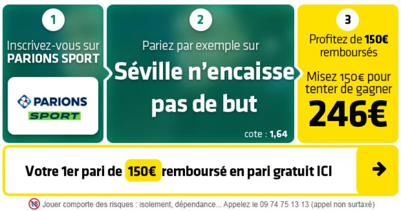 ► Le pari « Le FC Séville n’encaisse pas de but » est coté à 1,64 chez ParionsSport En Ligne qui vous offre votre 1er pari remboursé de 150€