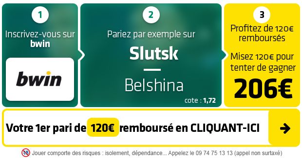 ► Le pari « Victoire Slutsk » est coté à 1,72 chez bwin, le seul site à vous offrir un premier pari remboursé de 120€