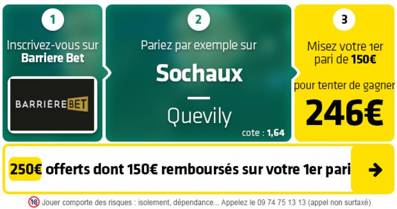 Si vous souhaitez parier sur ce Sochaux – Quevilly Rouen chez d’autres sites de paris sportifs, d’autres bonus vous sont offerts : – Un 1er pari remboursé EN CASH de 100€ avec PMU Sport200€ directs (Déposez 100€ et Misez avec 300€) avec WinamaxUn 1er pari remboursé de 150€ avec ParionsSport En LigneUn 1er pari remboursé de 100€ avec Betclic dès la fin du match – Un bonus EXCLUSIF de 200€ avec Unibet en rentrant le code « SOFOOT » – Un bonus ÉNORME & EXCLU de 150€ + 10€ SANS DÉPÔT avec ZEbet en rentrant le code « SOFOOT10 » – Un bonus ÉNORME & EXCLU de 150€ + 10€ SANS DÉPÔT avec NetBet, dont un 1er pari remboursé de 150€, en rentrant le code « SOFOOT10 » – 200€ remboursés avec VBET, sponsor de Monaco – Un 1er pari remboursé de 100€ + 50€ EN PLUS avec France PariUn 1er pari remboursé de 150€ avec BetwayUn 1er pari remboursé de 100€ avec PokerStars Sports