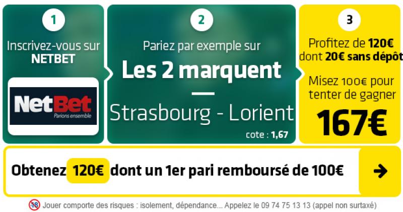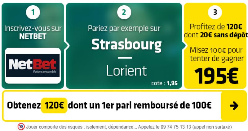 ► Le pari « Victoire Strasbourg » est coté à 1,95 chez NetBet, qui vous offre un 1er pari remboursé de 100€ + 20€ gratuit sans avoir à déposer en EXCLU sur SoFoot