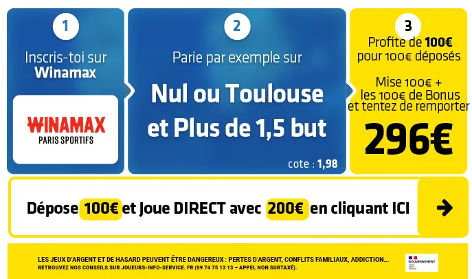 ► Le pari « victoire Toulouse ou match nul et plus de 1,5 buts » est coté à 1,98 chez Winamax qui vous permet de récupérer 100€ DIRECT (déposez 100€ et jouez avec 200€).
