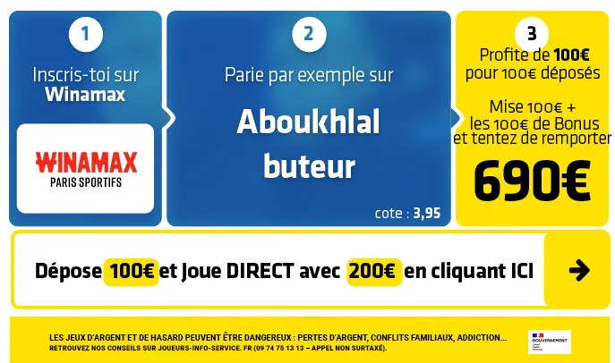 ► Le pari « Aboukhlal buteur » est coté à 3,95 chez Winamax qui vous permet de récupérer 100€ DIRECT (déposez 100€ et jouez avec 200€).