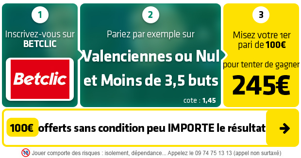 ► Le pari « Victoire Valenciennes ou match nul et Moins de 3,5 buts » est coté à 1,45 chez Betclic qui vous offre 100€ SANS CONDITION que votre 1er pari soit gagnant ou perdant