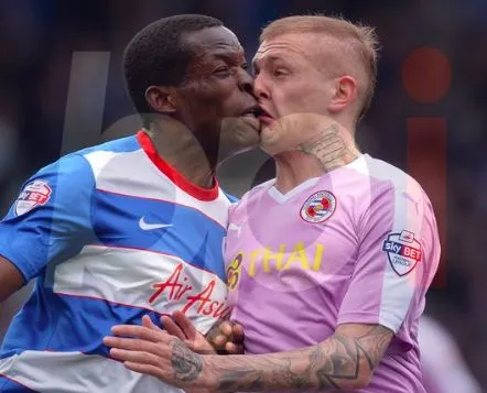 Le photographe anglais Joe Toth a dégainé son appareil au bon moment samedi lors du match entre Queens Park Rangers et Reading à Loftus Road. Alors qu’ils se disputaient un ballon lors d’un duel aérien, les bouches de Nedum Onuoha et Deniss Rakels se sont rencontrées pour un baiser ravageur.