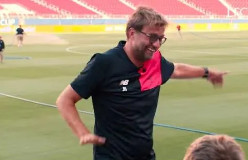 Depuis les gradins, une jeune fille lui a demandé d’imiter la danse de célébration de l’un de ses joueurs vedettes, Daniel Sturridge. Klopp s’exécute sans broncher. « Lorsqu’on commence cette danse, on ne peut plus s’arrêter. Si on la fait suffisamment longtemps, on peut même s’envoler » , a-t-il ensuite ajouté, tout sourire. Les heureux élus présents semblent avoir apprécié le geste plutôt fluide du coach des Reds.