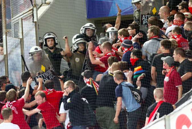 Une heure avant le match, la police grecque a réprimé à coups de matraque les Allemands situés dans le parcage visiteurs. La chaîne allemande Sport1 rapporte que les policiers ont réagi de manière « disproportionnée » à la suite de quelques provocations des fans du Bayern à l’encontre de leurs homologues de l’Olympiakos.