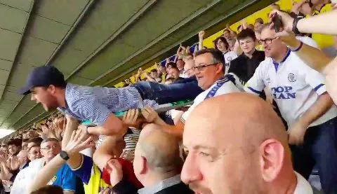 Alors que Leeds United a encore vécu une saison très frustrante en D2 anglaise, rythmée par les extravagances de son président et les résultats en demi-teinte, les fans des Whites prennent toujours du plaisir à venir supporter leur équipe. Alors que son équipe se déplaçait à Preston North End, un des supporters de Leeds ne semble pas s’être attardé sur le match nul (1-1) qui se profilait. Preuve en est, le supporter s’est mis à surfer littéralement sur le public, en faisant des aller-retours à l’aide d’une planche. Et le moins que l’on puisse dire, c’est que les autres se sont prêtés au jeu.