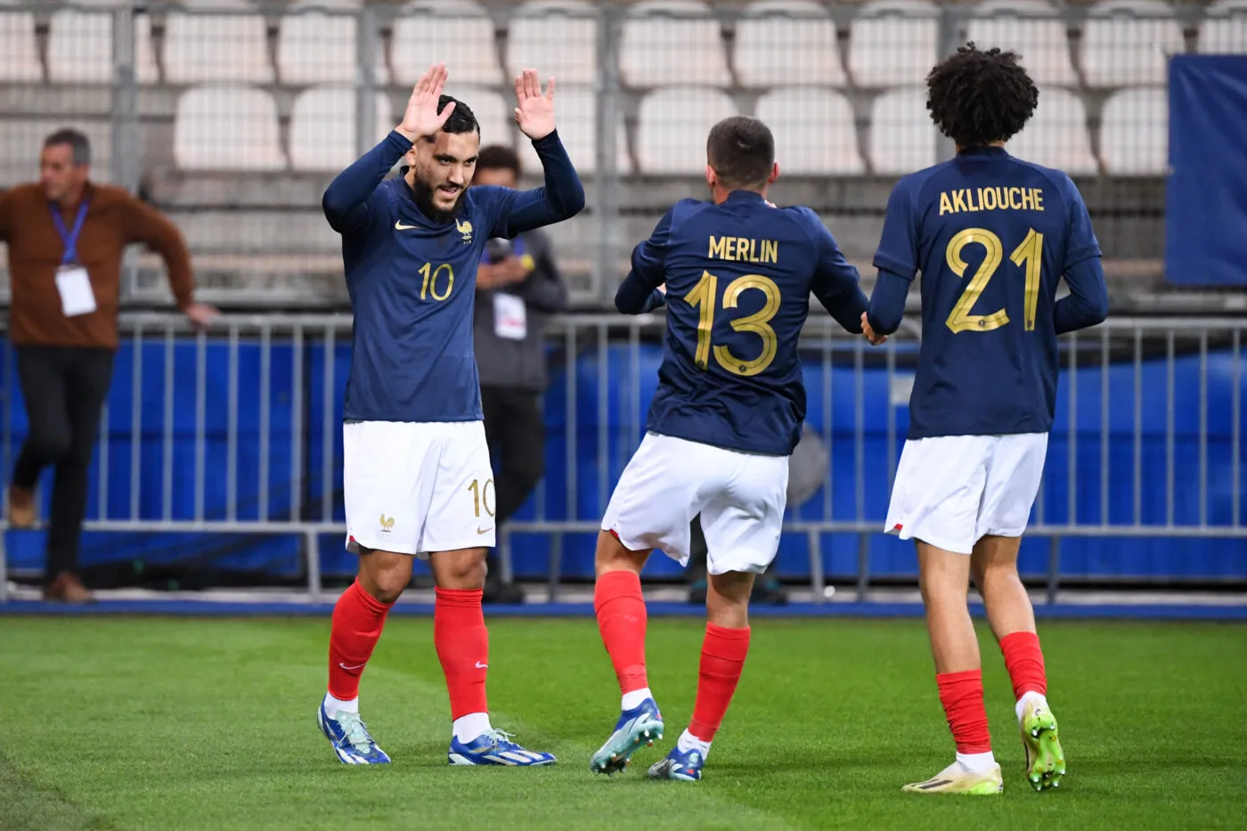 Guidée par un Rayan Cherki de gala, l’équipe de France Espoirs a pulvérisé Chypre ce mardi à Grenoble (9-0). Les Bleuets ont immédiatement mis la pression sur la défense adverse par l’intermédiaire d’Arnaud Kalimuendo, à quelques centimètres de couper victorieusement le centre de Cherki (4e). Extrêmement sollicité, le Lyonnais a débloqué le match en pénétrant dans la surface et en poussant Evagoras Antoniou au CSC (1-0, 13e). Kalimuendo a fait le break sur penalty, après un pied haut de Strahinja Kerkez (2-0, 30e), Maghnes Akliouche a alourdi le score sur une offrande de Cherki (3-0, 39e), et Kalimuendo a signé son doublé au bout d’un contre éclair (4-0, 45e).