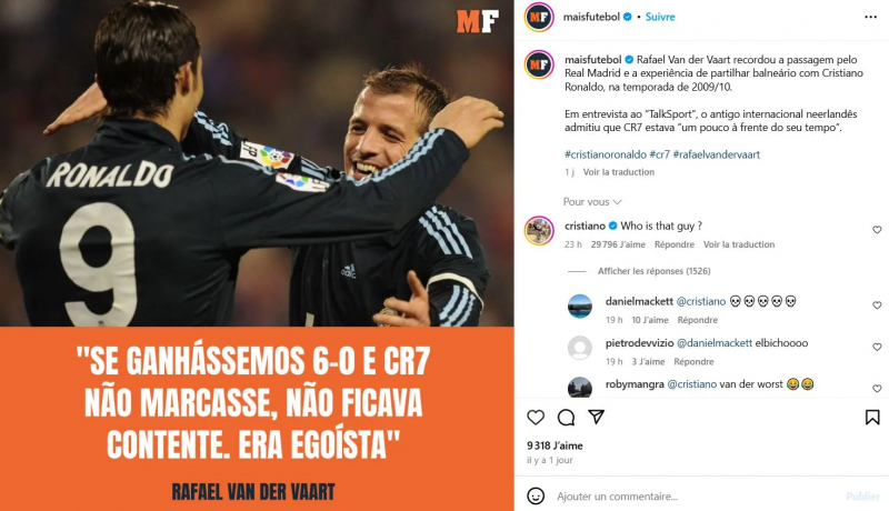 Réputé pour son franc-parler – comme beaucoup de Néerlandais –, Rafael van der Vaart en a également remis une couche, concernant Ruud van Nistelrooy cette fois : « J’ai connu la même chose avec Ruud. On discutait beaucoup ensemble et c’était intéressant, car il me répétait sans cesse : “Il faut que je marque, il faut que je marque !” » Cristiano Ronaldo et Van der Vaart ont disputé 21 rencontres ensemble au Real Madrid.