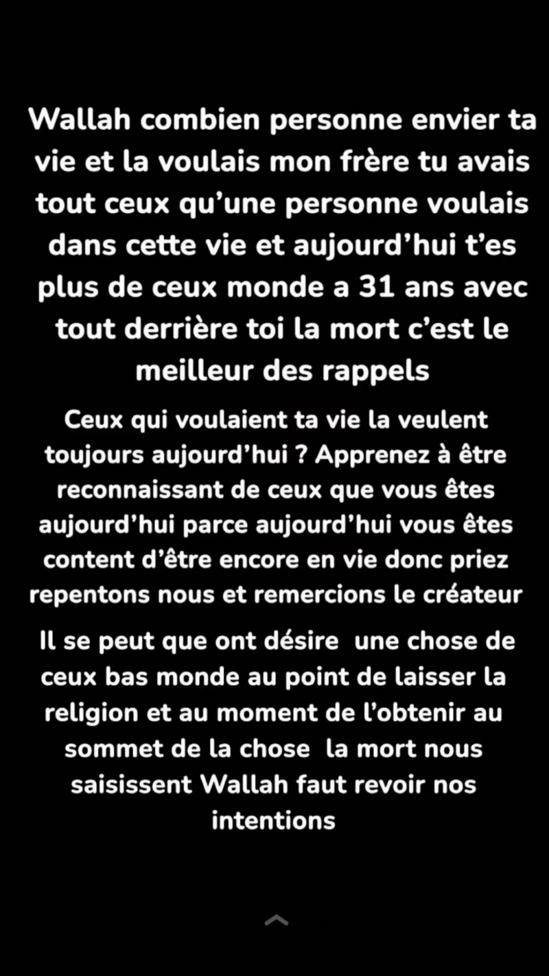 Dans la foulée de l’annonce, le joueur français Sacha Boey a rendu hommage à son ami – originaire de Montreuil comme lui – sur Instagram : « Combien de personnes enviaient ta vie et la voulaient, mon frère… Tu avais tout ce qu’une personne pouvait désirer dans cette vie, a notamment écrit le latéral du Bayern. Et aujourd’hui, tu n’es plus de ce monde à 31 ans, avec tout derrière toi. La mort, c’est le meilleur des rappels. Ceux qui voulaient ta vie la veulent-ils toujours aujourd’hui ? Apprenez à être reconnaissants de ce que vous êtes aujourd’hui, parce qu’aujourd’hui vous êtes encore en vie. »