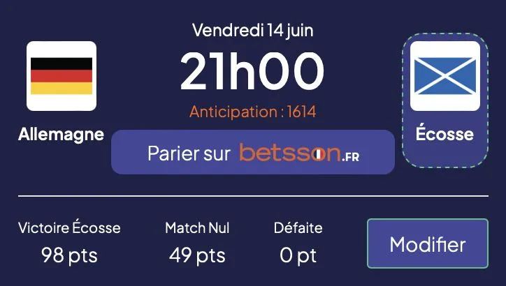 Et puis, n’avez-vous pas envie de frapper un grand coup d’entrée dans cette SFL Betsson Cup ? Imaginez un seul instant que l’Écosse gagne 1-0 : avec 103 points, vous mettrez dans votre rétroviseur bon nombre de participants frileux qui vont jouer la « sécurité » avec l’Allemagne. Et bon courage à eux pour vous rattraper. Dans le cas contraire, l’Allemagne déroule et s’impose 3-0 : vos adversaires n’auront que 27 points d’avance sur vous. Même 22 puisque McTominay va marquer. Un écart qui peut se combler très facilement. Alors, Let’s Go Tartan Army.