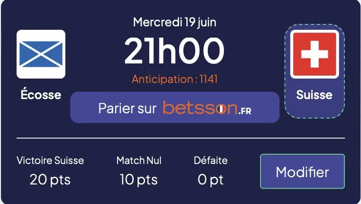 C’est parti pour la deuxième journée de l’Euro. Et dans la SFL Betsson Cup, il est impossible de reprendre une équipe déjà jouée par le passé durant toute la phase de groupes. C’est pourquoi nous ne pouvons pas choisir l’Écosse ou la Croatie. Quatre solutions s’offrent donc à nous. La Hongrie ? L’Allemagne devrait faire le job. L’Albanie ? L’exploit était proche face à l’Italie, et la Croatie risque de se rattraper de sa défaite contre l’Espagne. Ne reste alors plus que l’Allemagne et la Suisse. Et ce sont vers les Helvètes que nous allons nous tourner. Pourquoi ? Premièrement car nous n’aimons pas la simplicité. Deuxièmement, la Suisse a montré contre la Hongrie (3-1) qu’elle était capable de marquer des buts. Troisièmement, l’Écosse a montré contre l’Allemagne (1-5) sa fragilité défensive. Et enfin, car la Suisse est une équipe qui passe très souvent les poules – que ce soit au Mondial et à l’Euro – et qui s’incline ensuite en huitièmes de finale. Sauf quand elle joue contre la France. Alors que l’Écosse n’a jamais réussi à sortir des poules. Et ça ne sera toujours pas le cas en 2024.
