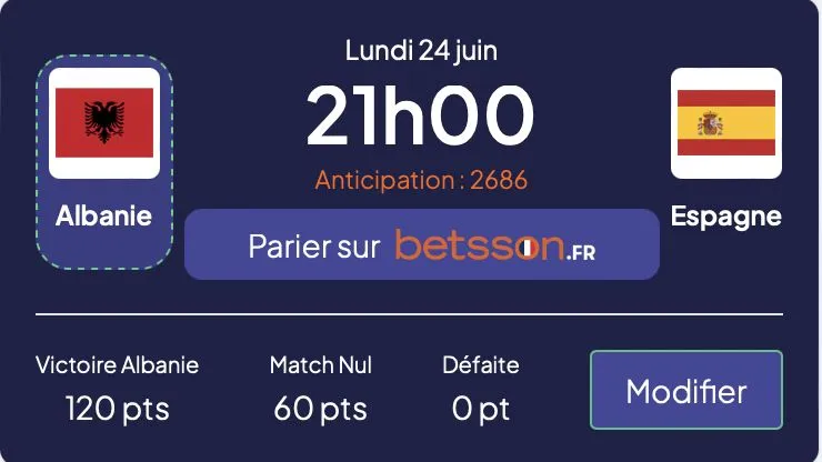 Avec 2 victoires en 2 matchs, l’Espagne a déjà validé son ticket pour les huitièmes de finale avant son dernier match contre l’Albanie. Mieux, la Roja est assurée de terminer à la première place de son groupe. En toute logique, Luis de la Fuente va donc envoyer une équipe B contre l’Albanie. Une aubaine pour les hommes de Sylvinho qui vont devoir s’imposer pour se qualifier pour les huitièmes de finale. Et même si les remplaçants espagnols ne sont pas des joueurs de district, l’Albanie va pouvoir profiter de ce turnover. D’autant plus que les Albanais ont montré de belles choses face à l’Italie (1-2) et surtout contre la Croatie (2-2) ouvrant le score à chaque fois et en se créant de grosses occasions. Troisièmes en 2016, mais pas dans les 4 meilleurs, les Kuq e Zi avaient échoué de peu à se qualifier pour les huitièmes. Huit ans plus tard, ils ne vont pas laisser passer leur chance. Alors, c’est le moment de rattraper votre retard sur vos concurrents en récupérant 125 points grâce à la victoire de l’Albanie.