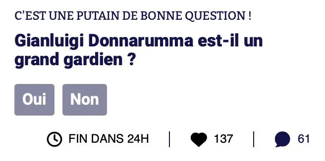 Deuxième nouveauté : les sondages. Après avoir constaté la folie de notre sondage sur le désintérêt autour du football sur X, avec plus de 30 000 participants, on s’est dit que c’était un peu chiant que ce soit Elon Musk qui en profite. C’est pourquoi on a développé notre outil de sondage, avec lequel nous poserons régulièrement des questions qui vous donneront l’occasion de débattre sur l’état du monde et du football. Il se situe en haut à droite quand vous êtes sur l’ordinateur du boulot ou un peu plus bas en scrollant sur la page d’accueil en mobile.
