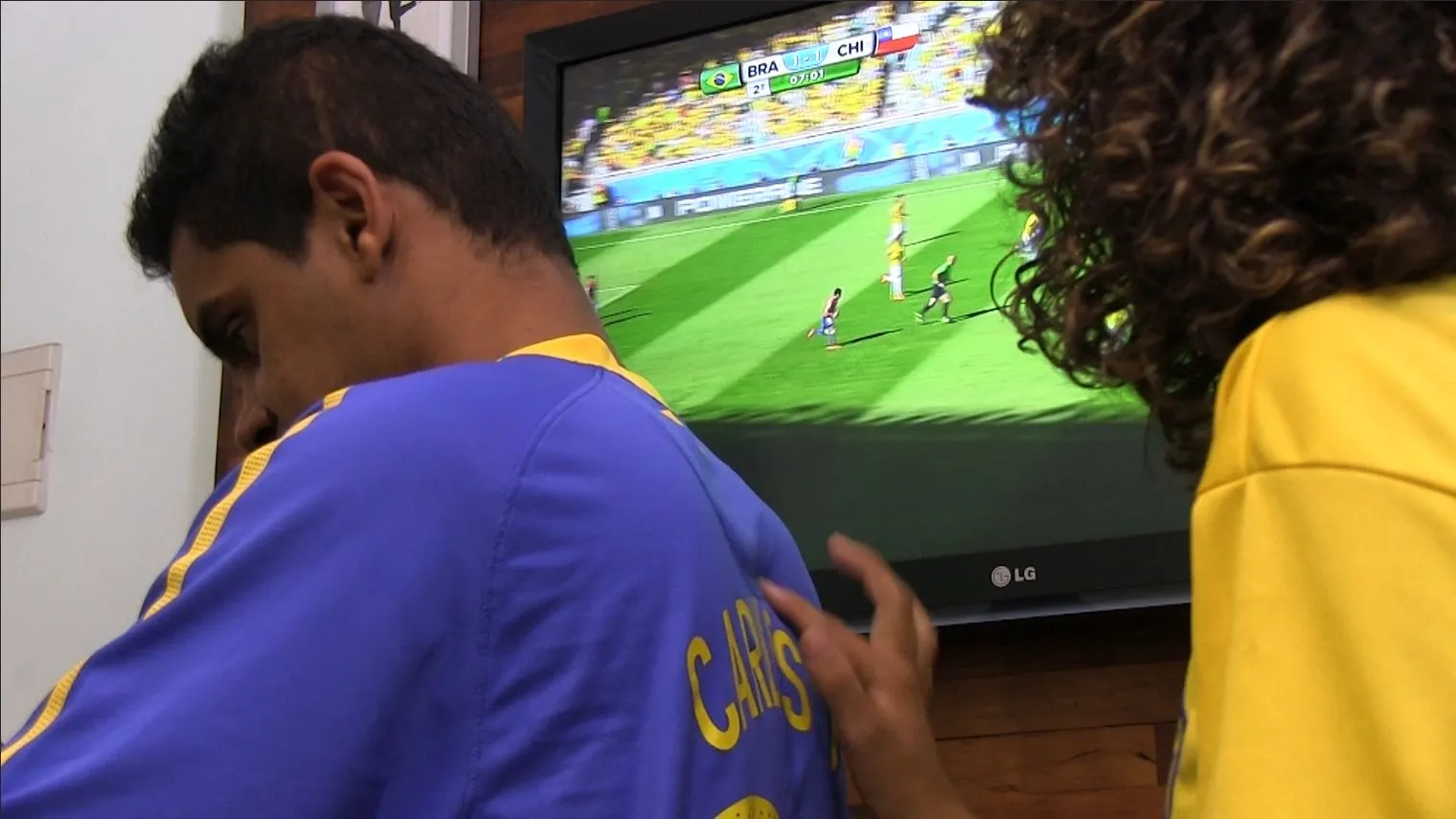 Ils sont trois, concentrés, installés autour d’une maquette représentant un terrain de football, comme devant une partie de Subbuteo. Mais deux d’entre eux ne regardent pas cette représentation de pré vert, Hélio et Régiane. Eux sont concentrés sur les images télévisées. Le troisième larron s’appelle Carlos. Il a la tête légèrement penchée, les mains tendus sur la maquette. Soudain, à l’écran, Alexis Sanchez est servi dans la surface et égalise pour le Chili. Carlos a compris exactement ce qu’il vient de se passer pour le Brésil, entre touche mollassonne de Marcelo, remise foireuse et sang-froid adverse. Il peut râler de prendre un but aussi bête. Sans rien voir, ni entendre, Carlos a tout compris. Ses accompagnateurs lui font les signes nécessaires à la compréhension de la vérité du terrain. Aveugle et sourd, Carlos regarde ainsi tous les matches du Brésil pendant cette Coupe du monde 2014, comme n’importe quel autre de ses compatriotes.