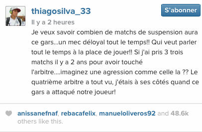 Présent dans le couloir au moment où le Bastiais a brisé le nez du Parisien avant de fuir – un headjacking quoi – Thiago Silva a posté une photo sur Instagram afin de régler ses comptes avec l’ancien Marseillais.