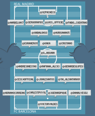 Les footeux du Real et du Barça ont beau ne pas être très futés, ils savent quand même se servir d’un clavier et d’une souris pour aller sur Twitter poster tout et n’importe quoi sur leur vie tant professionnelle que privée. On se souvient d’un Sergio Ramos twittant une vidéo où l’on voyait Casillas et Arbeloa faire la course après l’entraînement par exemple. Mais comme le prouve la photo ci-jointe ,à ce petit jeu là, personne n’a pris l’avantage entre Madrilènes et Catalans. Six titulaires de chaque équipe utilisent assidûment le réseau social. Dont un seul français Lassana Diarra et son pseudo pas du tout kitsch @lass_officiel.Benzema et Abidal n’ont pas le temps pour ça, ils jouent plus souvent.