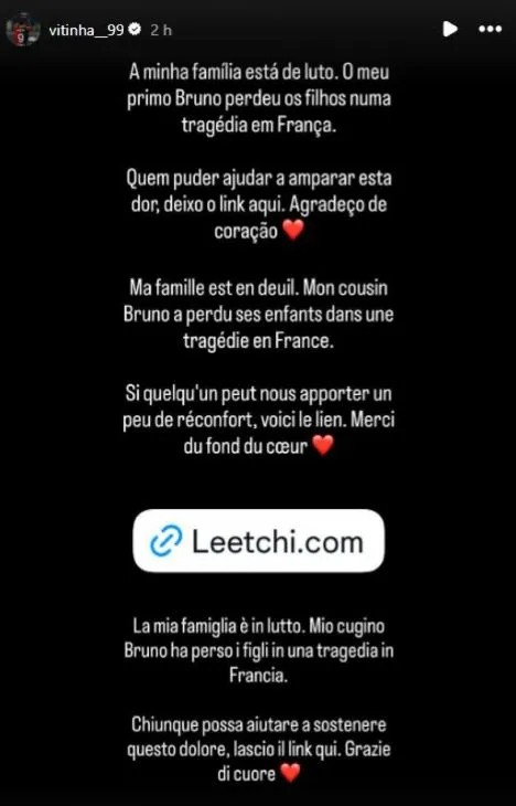 « Ma famille est en deuil. Mon cousin Bruno a perdu ses enfants dans une tragédie en France », a écrit l’attaquant du Genoa sur Instagram, qui a ajouté le lien vers une cagnotte Leetchi. Créée mardi avec l’accord des parents selon sa description, la cagnotte a récolté plus de 20 000 euros en 24 heures.