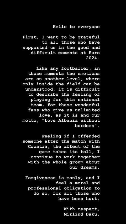 « Comme pour n’importe quel footballeur, les émotions dans ces moments-là atteignent un niveau très particulier, a-t-il écrit. C’est quelque chose qu’on ne peut comprendre qu’en étant sur un terrain, il est difficile de décrire le sentiment qu’on a quand on joue pour l’équipe nationale, a réagi le joueur du Rubin Kazan. S’excuser, c’est être un homme. C’est une obligation morale et professionnelle de le faire, auprès de tous ceux que j’ai pu blesser. Je suis désolé si j’ai offensé qui que ce soit après le match contre la Croatie, l’adrénaline du match a fait son effet. » Historiquement, les relations entre l’Albanie et la Macédoine du Nord – nation qui n’est pas présente à l’Euro – ont toujours été conflictuelles.
