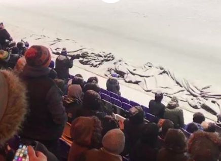 Un joueur de Peterborough aide à déneiger pour poursuivre le match