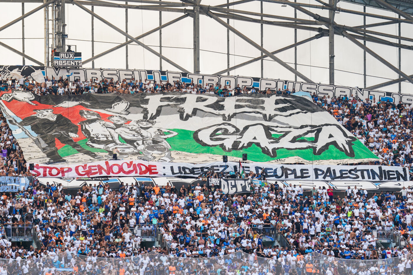 « Free Gaza / Stop génocide : Libérez le peuple palestinien ! », a-t-on pu lire sur cette dernière. Plusieurs drapeaux palestiniens ont également été aperçus dans les deux virages du stade tout au long de la partie. Un soutien affiché par les supporters marseillais alors que l’ONU a officiellement déclaré l’état de famine dans la bande de Gaza ce vendredi 22 août, après près de deux ans d’un conflit qui a déjà coûté la vie à plus de 50 000 personnes, dont une très large majorité de civils.