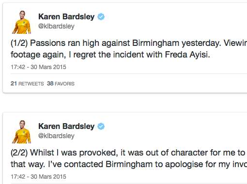 D’après la BBC, l’attaquant de Birmingham, Ayisi, a donné un violent coup de coude dans la poitrine de la gardienne, qui a réagi en se battant avec elle. Si la première a été expulsée dans la foulée, Bardsley n’a pas pris de carton rouge. La FA a d’ores et déjà mise en garde la portière, qui pourrait subir une lourde sanction. Elle s’est d’ailleurs déjà excusé sur les réseaux sociaux.