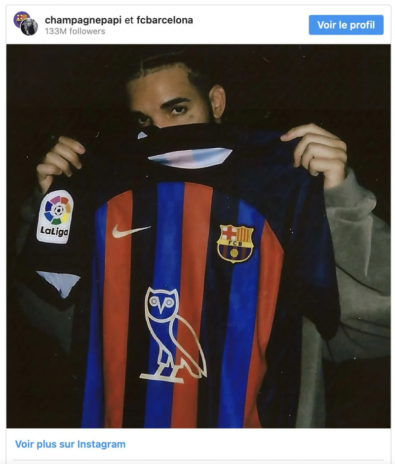 Les Catalans avaient perdu le premier match de championnat à Madrid, 3-1. Ce jour-là, ils portaient un maillot floqué du logo d’OVO, la marque du rappeur Drake, à savoir une chouette. On est loin du sponsor Unicef, mais cette collaboration s’inscrit dans l’énorme partenariat noué entre Spotify et le FC Barcelone, qui permet au club entraîné par Xavi d’afficher ce genre de fantaisie sur sa tunique en Liga.