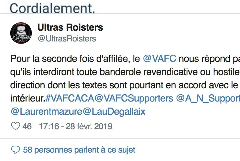 Pour la seconde fois d’affilée, le @VAFC nous répond par écrit qu’ils interdiront toute banderole revendicative ou hostile à la direction dont les textes sont pourtant en accord avec le règlement intérieur.#VAFCACA@VAFCSupporters @A_N_Supporters @Laurentmazure@LauDegallaix pic.twitter.com/0PMp79WxNN