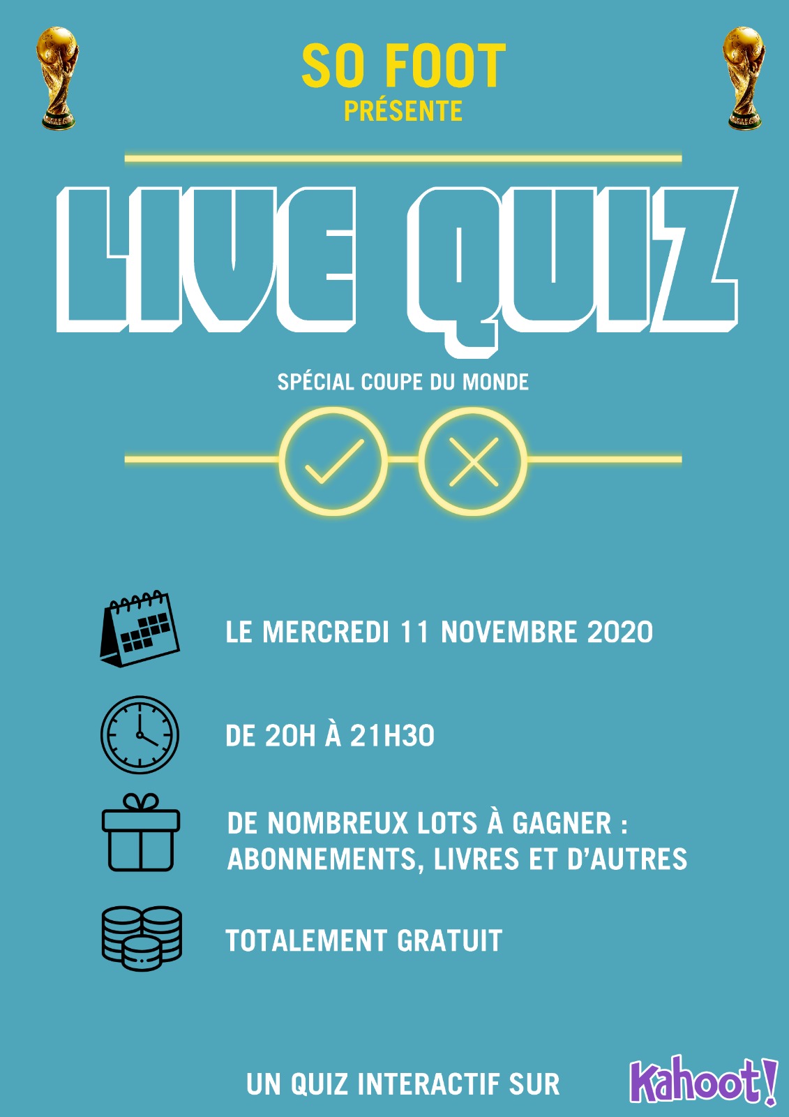 Le principe : En solo, venez affronter en live d’autres fans de (so)foot en répondant le plus correctement et rapidement possible à une série de QCM interactifs sur votre tablette, smartphone ou ordinateur lors d’une session animée par un journaliste de la rédaction. Avec un thème cette fois, la Coupe du Monde.