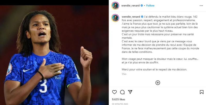 « J’aime la France plus que tout, […] mais je ne peux plus cautionner le système actuel, bien loin des exigences requises par le plus haut niveau », peut-on lire dans le communiqué de la défenseuse. Nul doute que sont pointées les divergences avec la sélectionneuse Corinne Diacre et son staff, à l’instar de Sarah Bouhaddi, qui avait clairement exprimé son refus de rejouer en sélection, ou Amandine Henry, qui n’avait pas hésité à décrire l’ambiance pesante au sein de la sélection durant la Coupe du monde 2019. Ce qui lui a valu de ne plus être convoquée depuis. Renard sait qu’elle a mis le doigt dans l’engrenage puisqu’elle écrit : « Je ne ferai pas cette coupe du monde dans de telles conditions. » La Lyonnaise fait également part du poids mental que représente sa vie en sélection : « Mon visage peut masquer la douleur, mais le cœur, lui, souffre…et je n’ai plus envie de souffrir. » Ce message aura le mérite d’avoir lancé un nouveau pavé dans la mare.