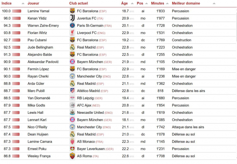 Derrière l’Espagnol, on retrouve Kenan Yildiz et Warren Zaïre-Emery. Décidément, le Bayern Munich a bien fait de laisser partir le Turc à la Juventus quand ce dernier était encore en équipes de jeunes… Pour rassurer les Bavarois : Aleksandar Pavlović occupe la huitième place du classement.